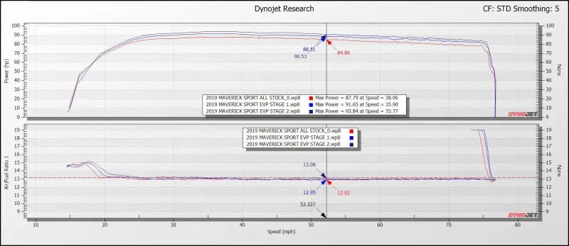 The Maverick Sport is a game changing vehicle - 1000cc in a 60" wide package. EVP has worked their magic and through tuning and exhaust components and have achieved significant horsepower gains through timing, fueling, torque limit modifications, rev limits, speed limits, etc. We also build additional safety into our tune by lowering the fan on temperature. The OEM fan on temperature is is too high (well over 200 deg F). In addition the fan on/off temperatures can be set for each customer depending upon where they live and the conditions typically ridden in. Other great features are added and/or changed to enhance the drivability and fun factor of the vehicle.