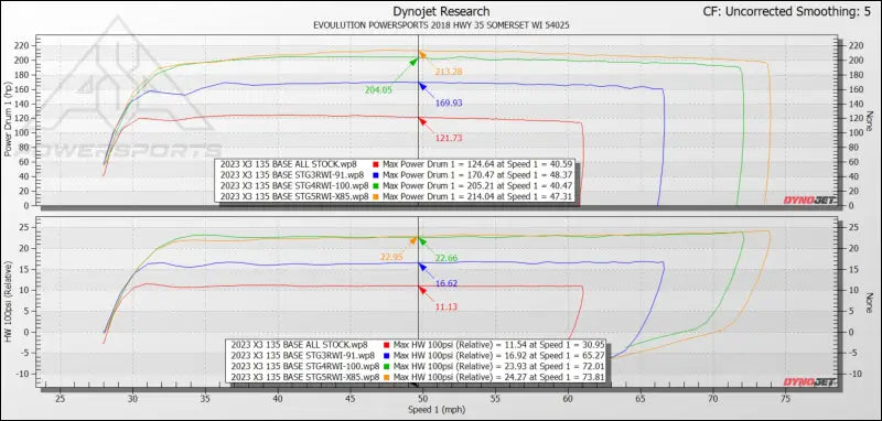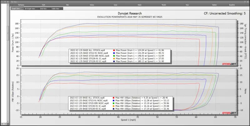Despite these updates for 2023, the stock ECU calibration still limits the overall “fun factor,” drivability, and performance of the 135 HP Turbo. After thorough testing in the Dyno Lab and pushing the base model to its max on the EVP testing grounds, we’ve unleashed its untapped potential with an all-new X3 135 Intercooled Power Pack and ECU flash that transforms the base model into a completely different animal packed with Turbo RR power!