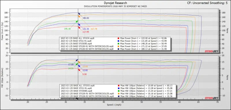| Stage 5-E85 | E85 | 10-14 lbs. | 148 | 170 | MG1 ECU Unlock | EVP WB Belt, Exhaust, V-Flow Intake, Clutch Kit, Spark Plugs |