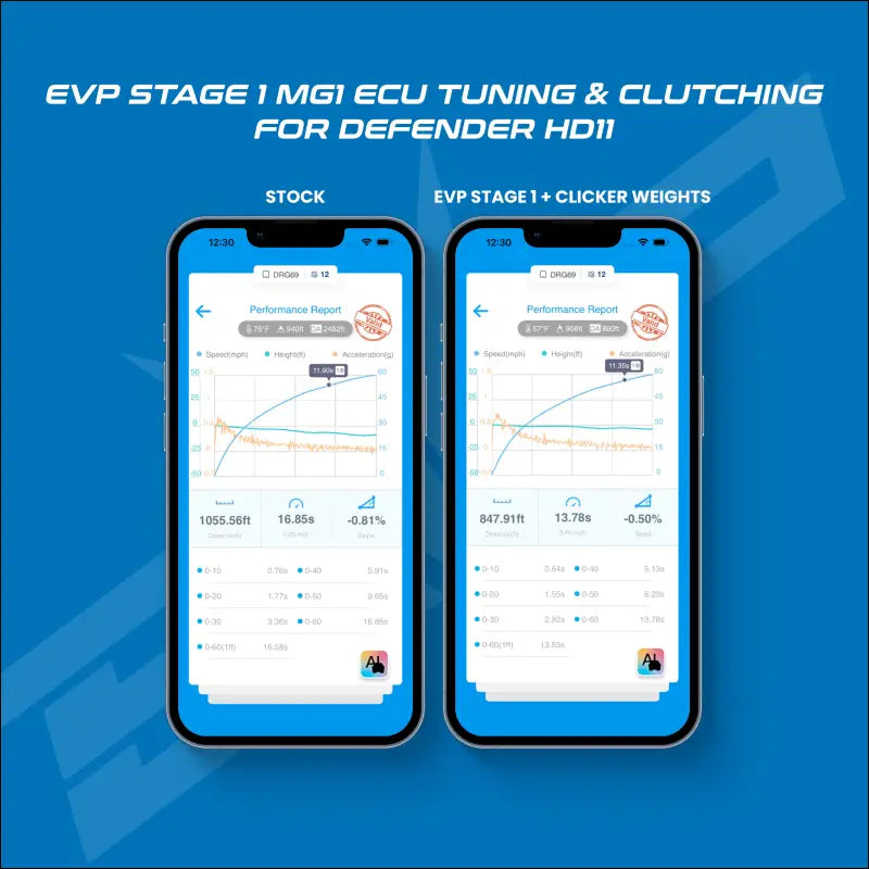 *EVP DISCLAIMER: All Dyno runs were performed in EVP's Wisconsin R&D center. Performance may vary based on atmospheric conditions and/or altitudes. Horsepower gains noted are the result of a combination of EVP Stage 1 Tune & EVP Clicker Clutch Weights.