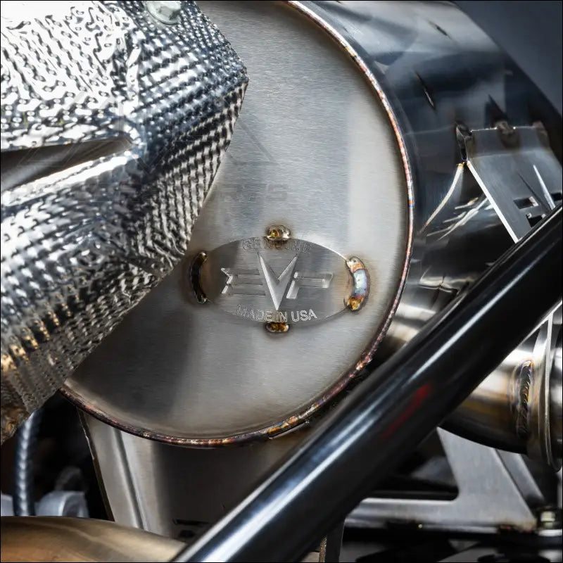 Handmade in limited batches, all EVP Maverick R Dynamic Twin Exit Mufflers come with a serialized production number badge welded onto the canister.