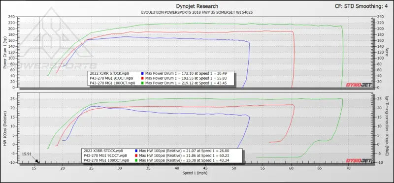 DYNO NOTE: Due to the MG1 ECU torque strategy, the boost figures listed represent maximum boost on a hot engine. When intake temps are cooler, boost will be lower, however, it will make the same power as when the boost is higher. The ECU always tries to make the same power given environmental conditions and it does this by allowing the boost to increase as the intake temperature climbs.